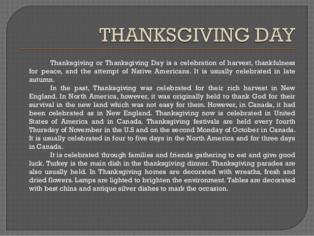 Thanksgiving is a holiday celebrated predominantly in north america and it possesses a different meaning in each of the countries where its acknowledged. Well i would like to say a few words if i may. In the past thanksgiving was celebrated for their rich harvest in new england.