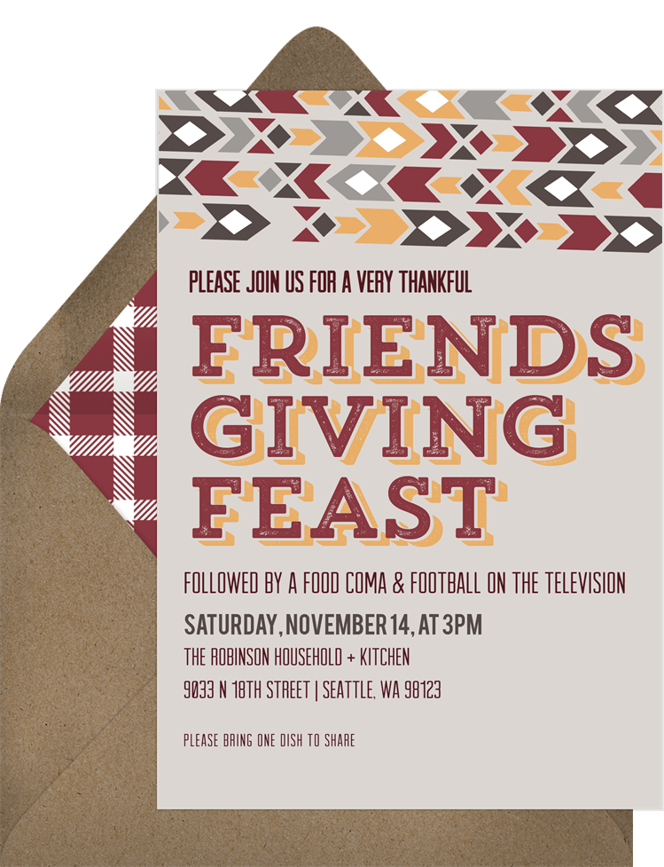 When you ask someone to celebrate thanksgiving with you that is called a thanksgiving invitation. Plan a thanksgiving feast potluck or gratitude dinner go to the parade watch the football game together grab drinks the night before or reunite with friends for friendsgiving. This gorgeous thanksgiving dinner invitation is a burst of the seasons richest hues.