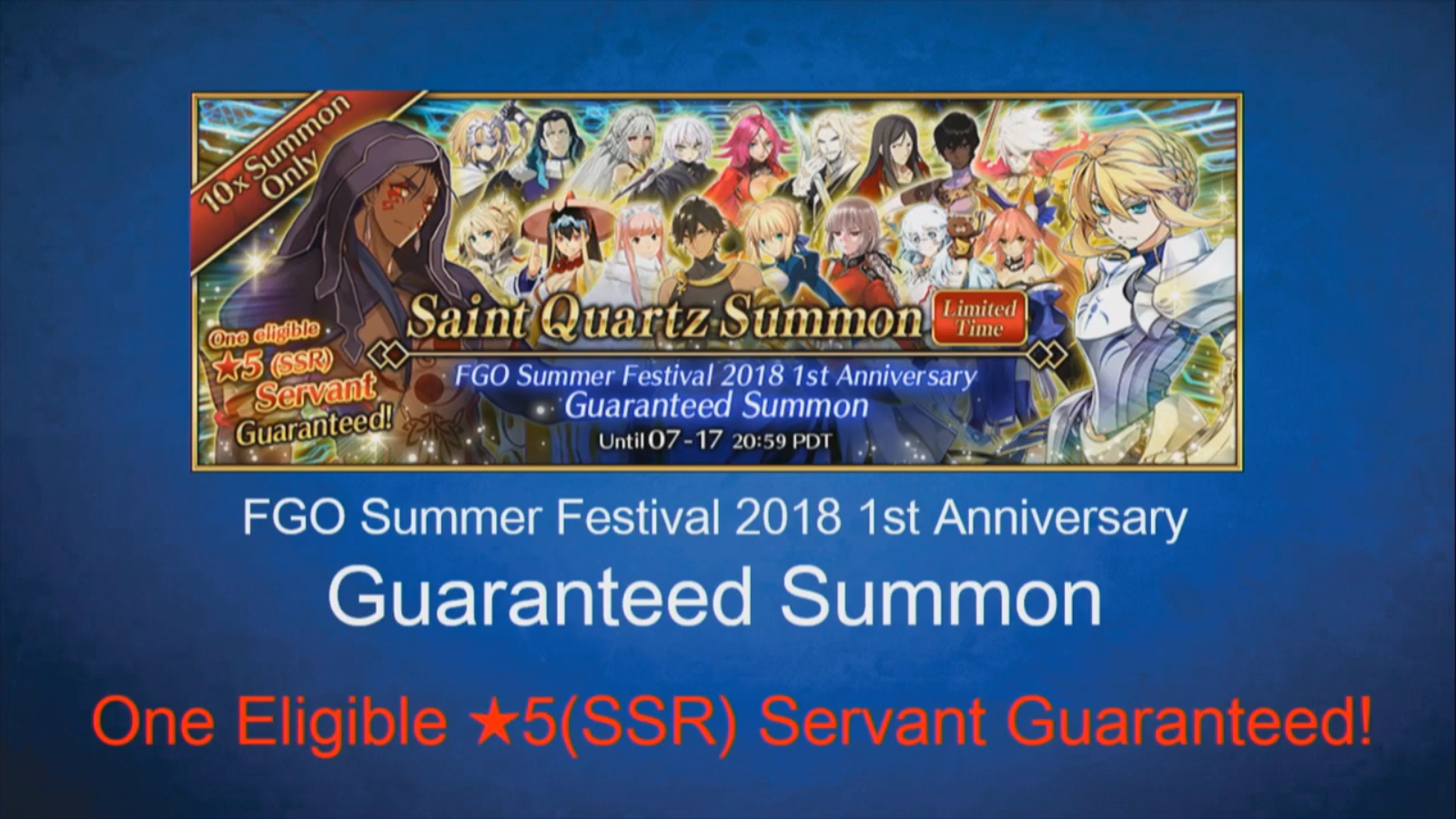 The guaranteed gacha will 100 summon at least one 5 servant. Its the first guaranteed gacha where any released servant except sherlock can be rolled. For this campaign astolfo will receive a new spiritron dress.